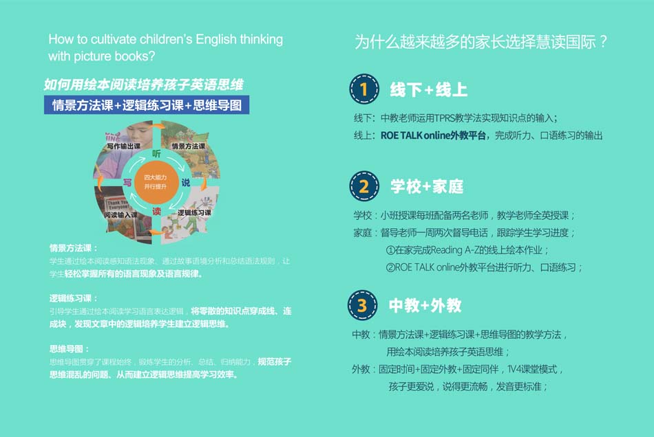 中教:情景方法課+邏輯練習(xí)課+思維導(dǎo)圖的教學(xué)方法,用繪會本閱讀培養(yǎng)孩子英語思維;