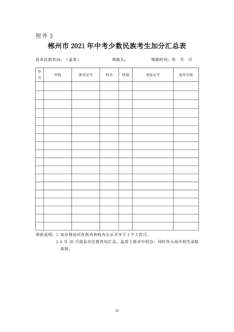 各縣市區(qū)教育局應將少數(shù)民族考生加分情況,錄入“郴州市高中階段招生錄取系統(tǒng)”(以下簡稱“高中招生錄取系統(tǒng)”),并于6月20日前將《郴州市2021年中考少數(shù)民族考生加分匯總表》(附件3)報市中招辦