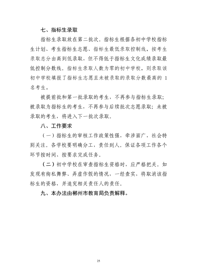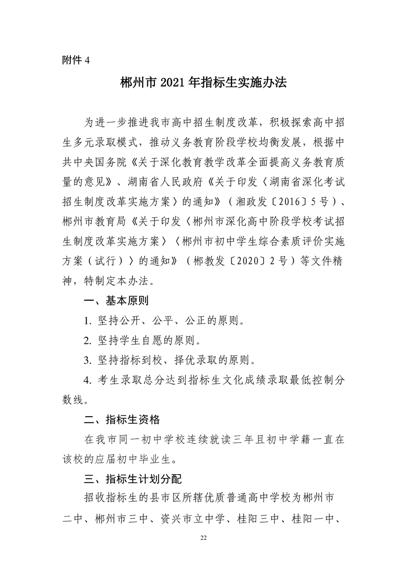 指標生由各縣市區(qū)教育局制定招生實施方案,明確分配到初中學校的指標生計劃,細化指標生資格審核程序等,報市級教育行政部門備案,并提前向社會公布。具體實施辦法見《郴州市2021年指標生實施辦法》(附件4)