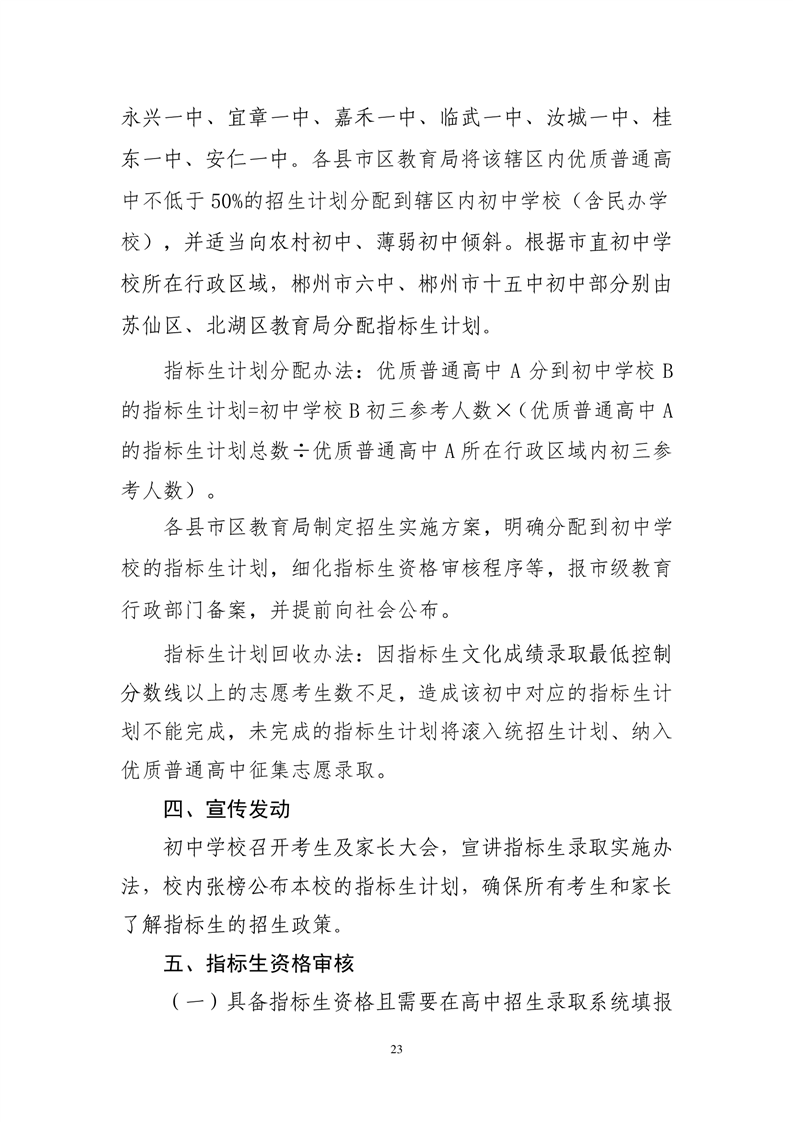 指標生計劃在招生計劃中單列。各縣市區(qū)教育局將所轄公辦優(yōu)質普通高中不少于50%的招生計劃(具體比例由各縣市區(qū)教育局確定)分配到區(qū)域內的初中學校(含民辦學校),并適當向農村初中、薄弱初中傾斜分配指標生計劃的優(yōu)質普通高中為郴州市二中、郴州市三中、資興市立中學、桂陽三中、桂陽一中、永興一中、宜章一中、嘉禾一中、臨武一中、汝城一中、桂東一中、安仁一中等12所縣市區(qū)所轄優(yōu)質普通高中。