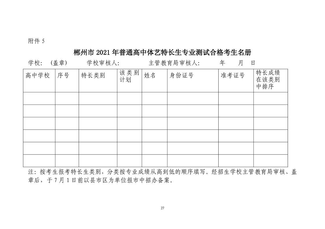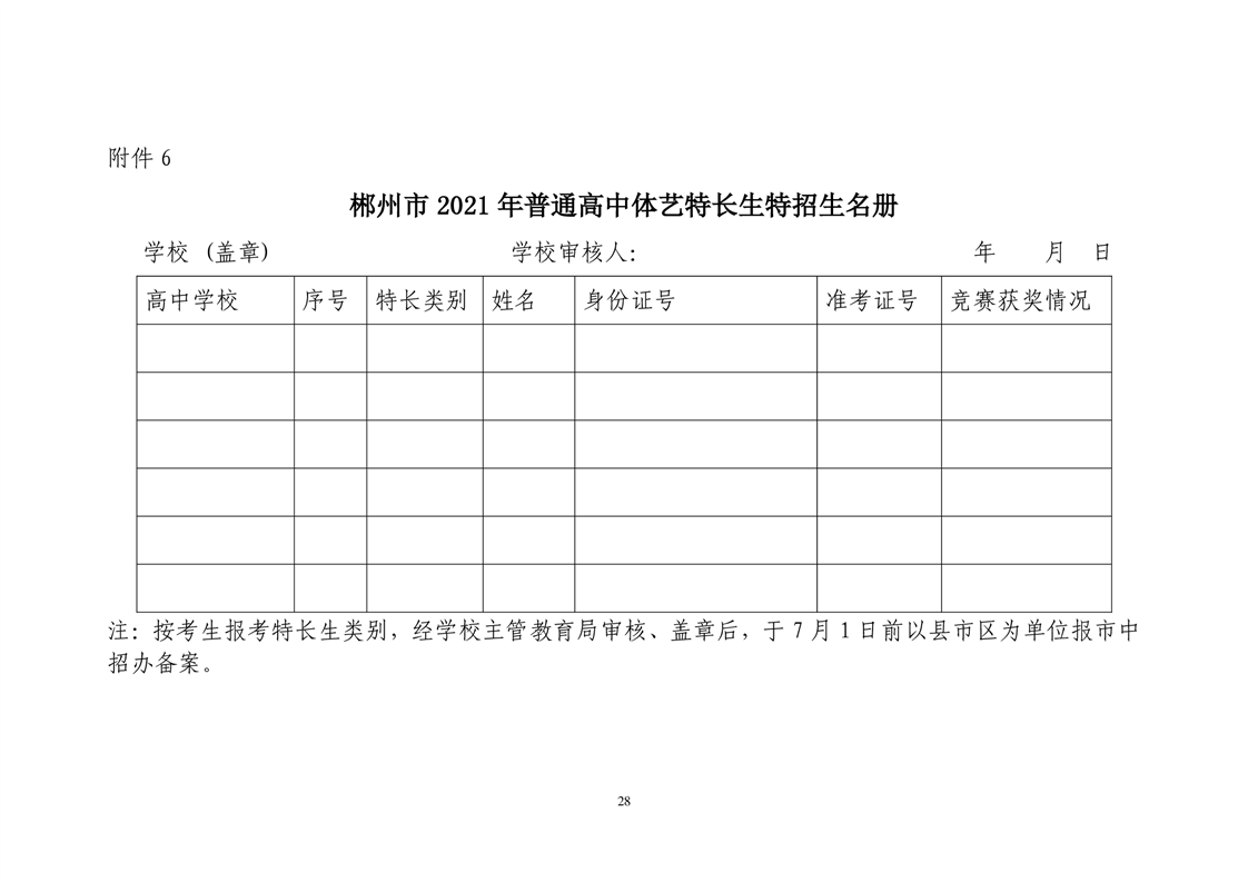 4.郴州市2021年指標生實施辦法5.郴州市2021年普通高中體藝特長生專業(yè)測試合格考生名冊6.郴州市2021年普通高中體藝特長生特招生名冊