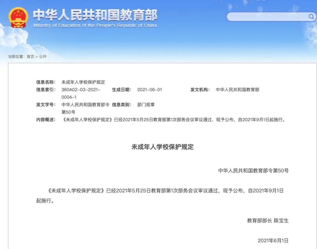 6月1日,教育部舉辦新聞發布會,時任教育部部長陳寶生簽發了第50號教育部令,頒布《未成年人學校保護規定》(以下簡稱《規定》)。