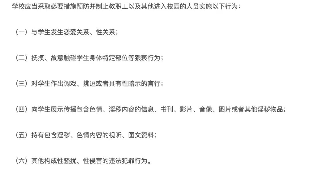 《規定》中第三章第二十四條規定: 學校應當建立健全教職工與學生交往行為準則、學生宿舍安全管理規定、視頻監控管理規定等制度,建立預防、報告、處置性侵害、性騷擾工作機制。