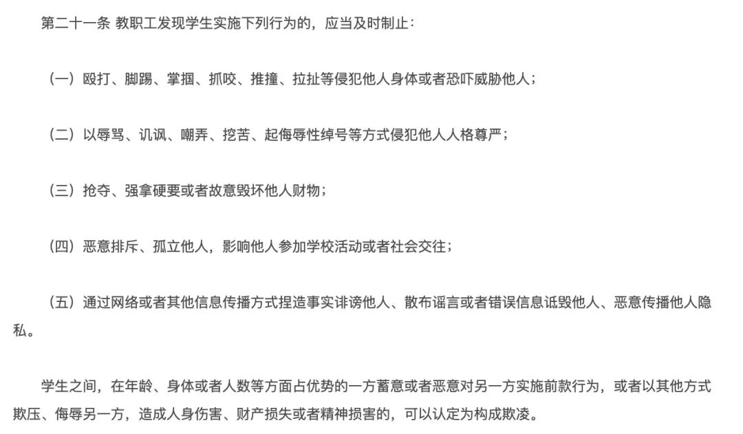 此外,今年6月1日,新修訂的《未成年人保護法》正式施行?!段闯赡耆吮Wo法》附則中對校園欺凌做了定義,叫“學生欺凌”。