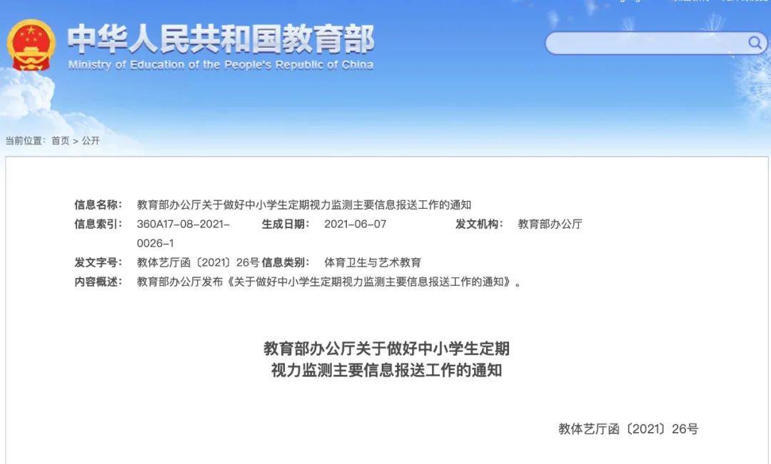 6月3日,教育部印發《關于做好中小學生定期視力監測主要信息報送工作的通知》,切實落實學生健康體檢制度和視力監測制度。